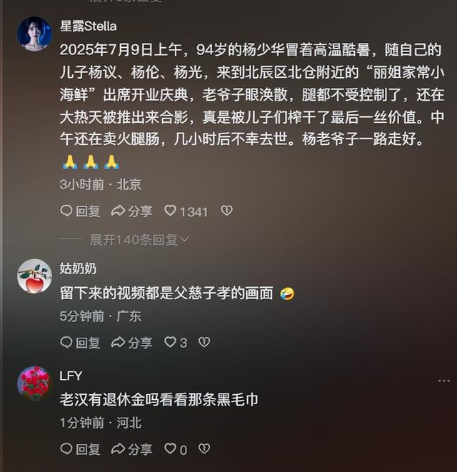 虽然说自始至终杨老都没有突然去世的征兆,但一个90多岁的老人,还顶着高温天气,被儿子推着参加商业活动,真的令人心疼。
